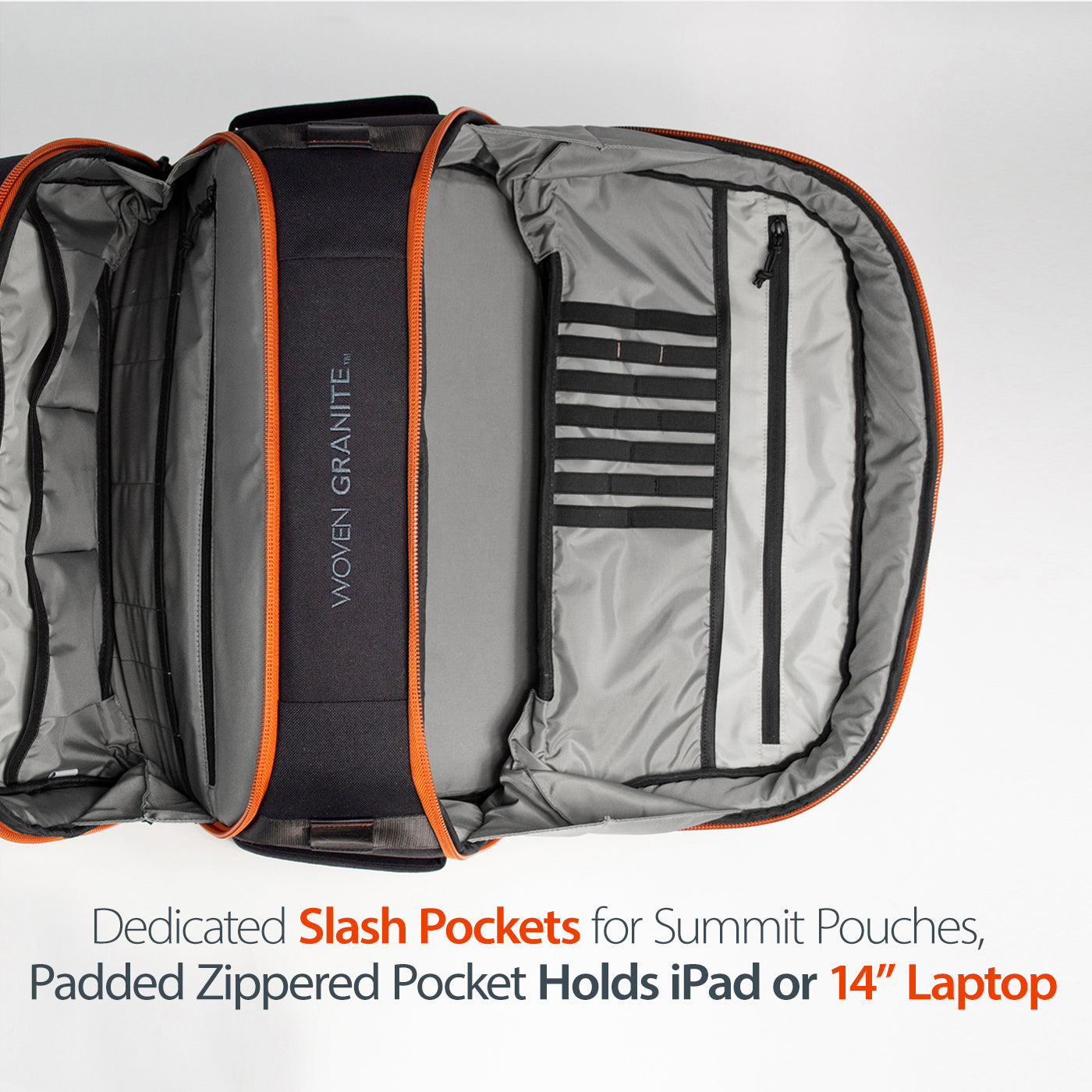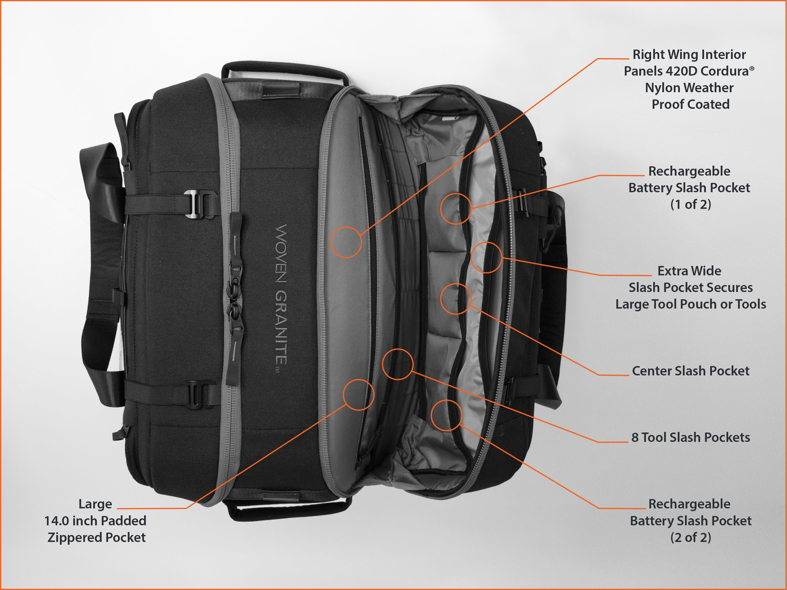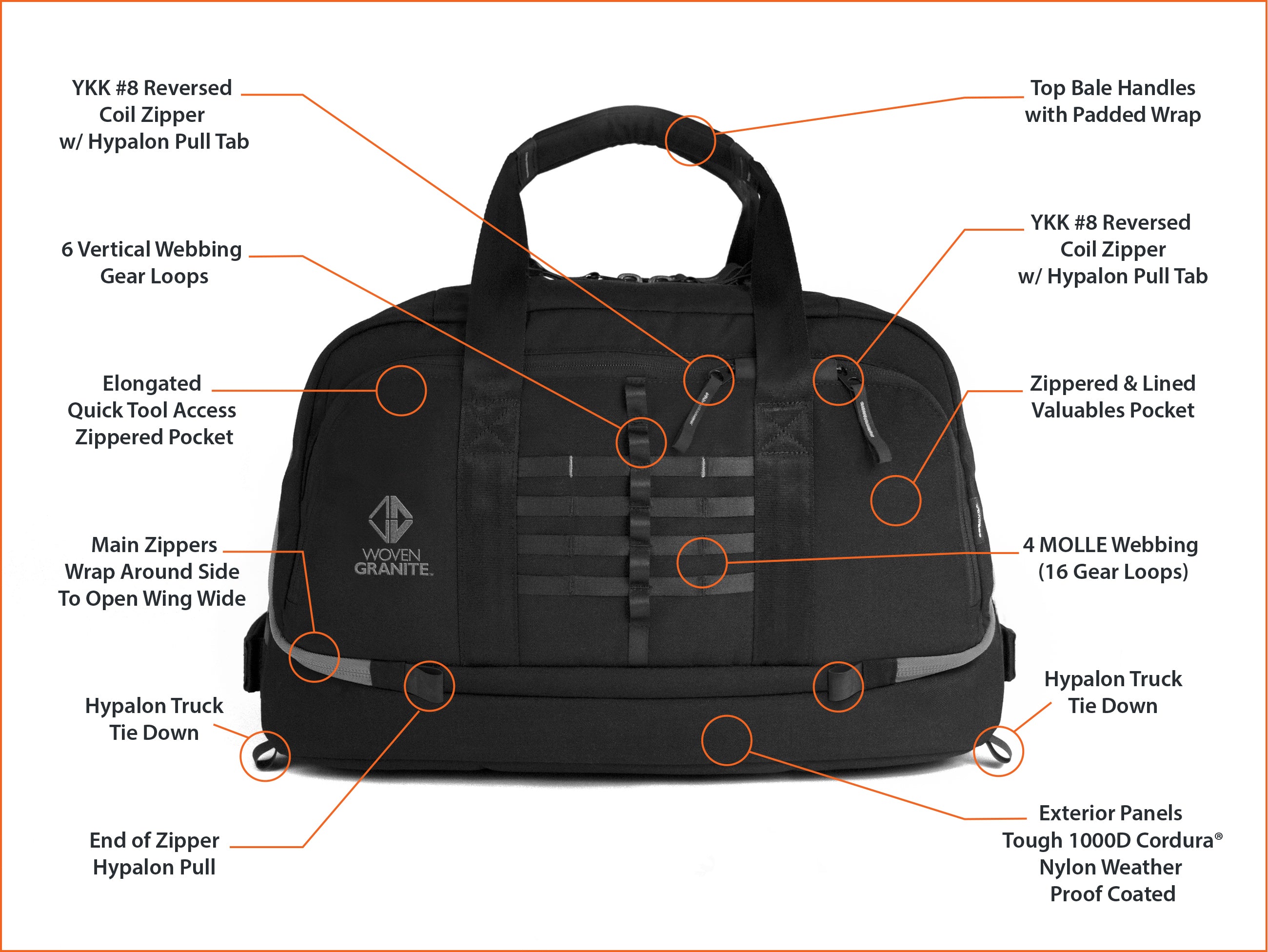 (All Woven Granite’s gear incorporate the highest quality YKK zippers for durability and smooth operation)