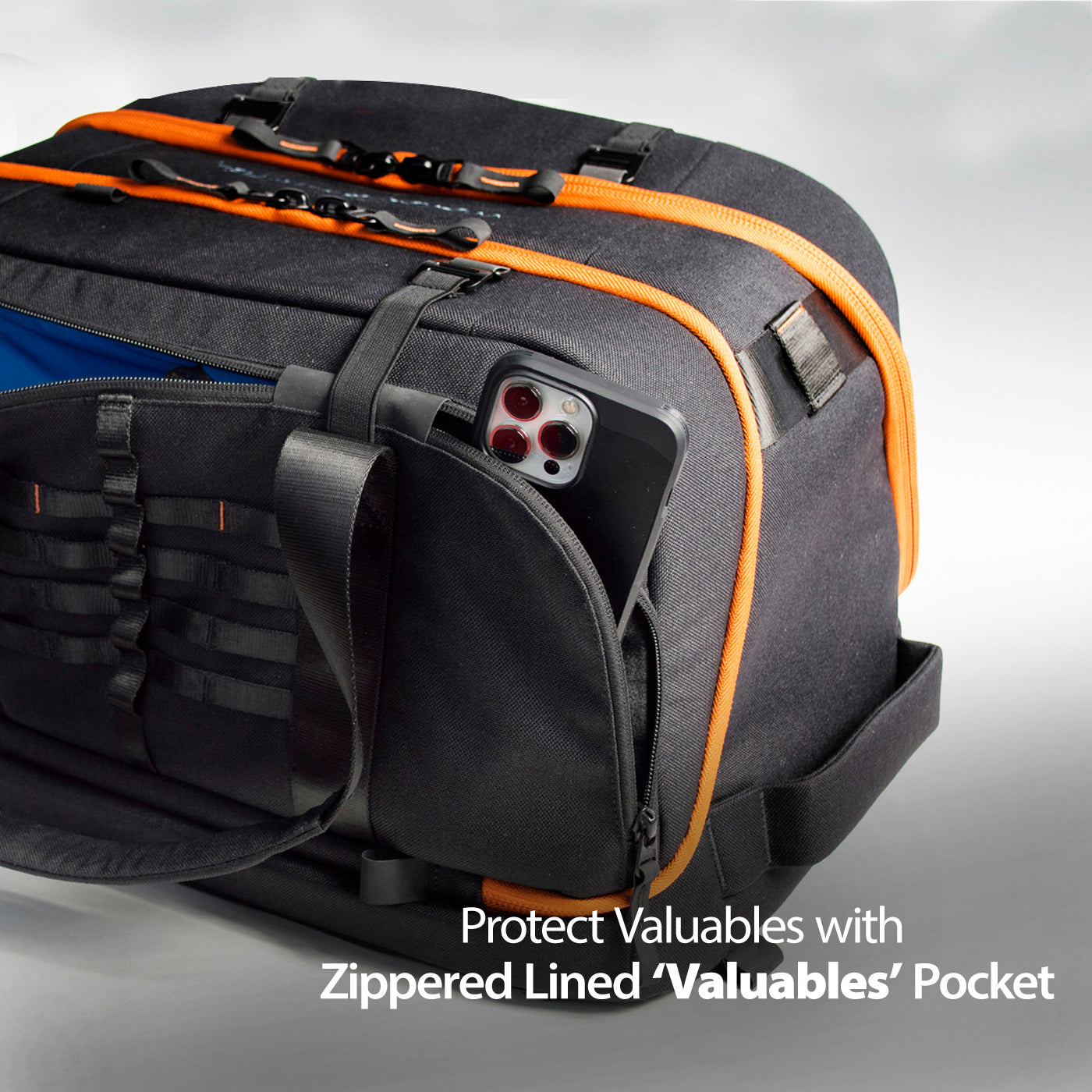 - Dedicated fleece lined valuables pocket secures your cellphone, keys and important personal items. Providing easy access to tools without opening the zippers to the main compartment.