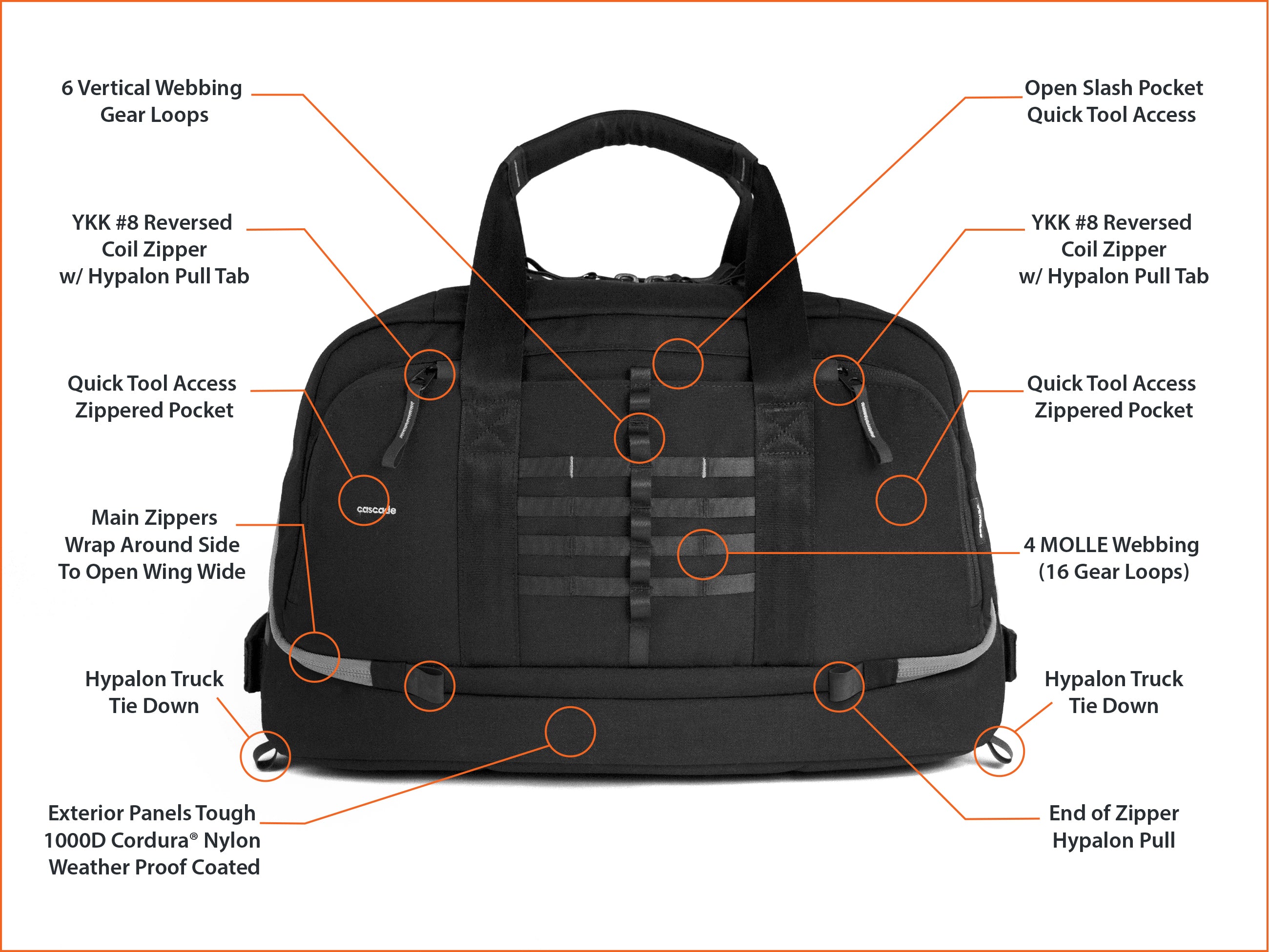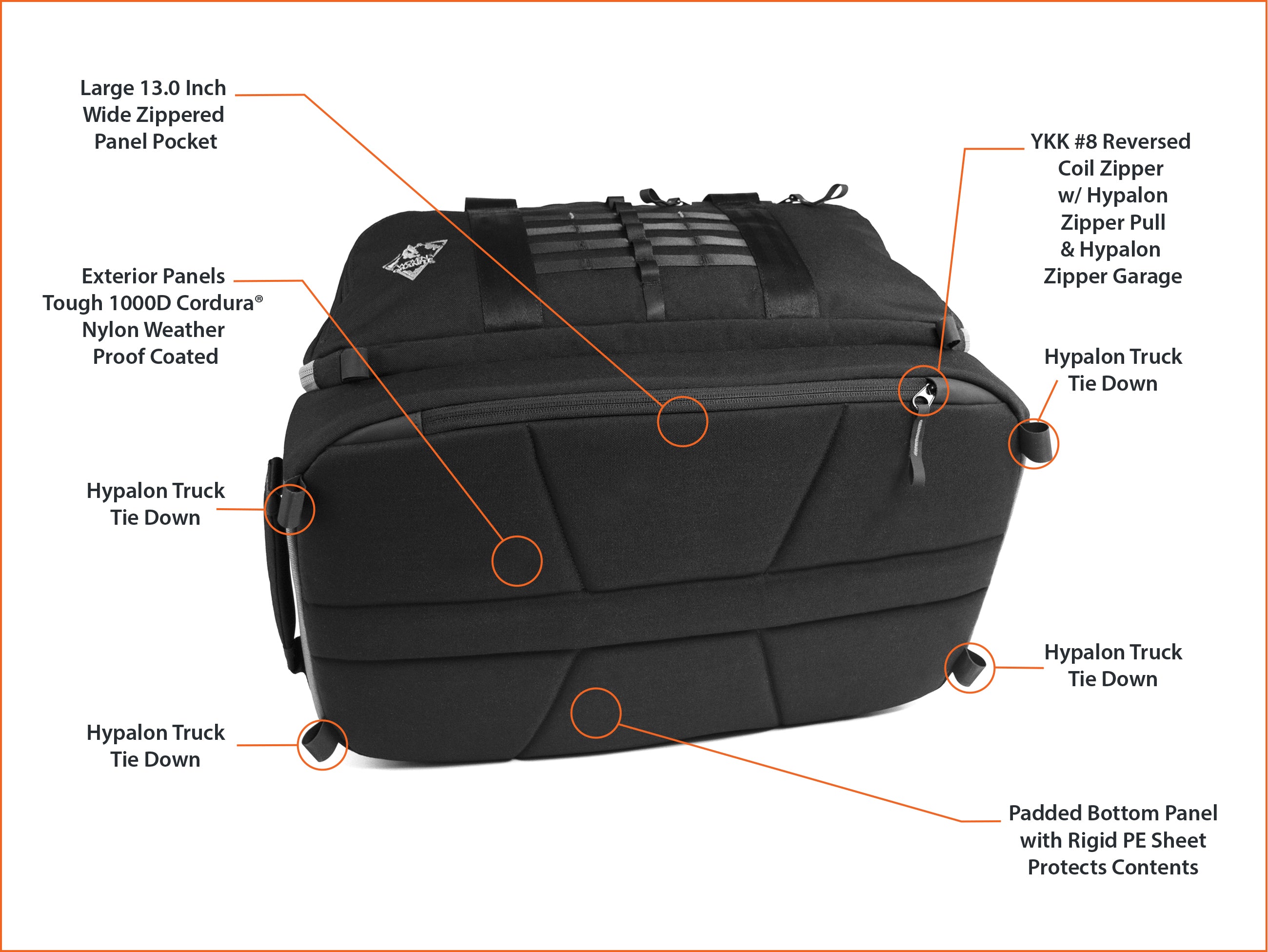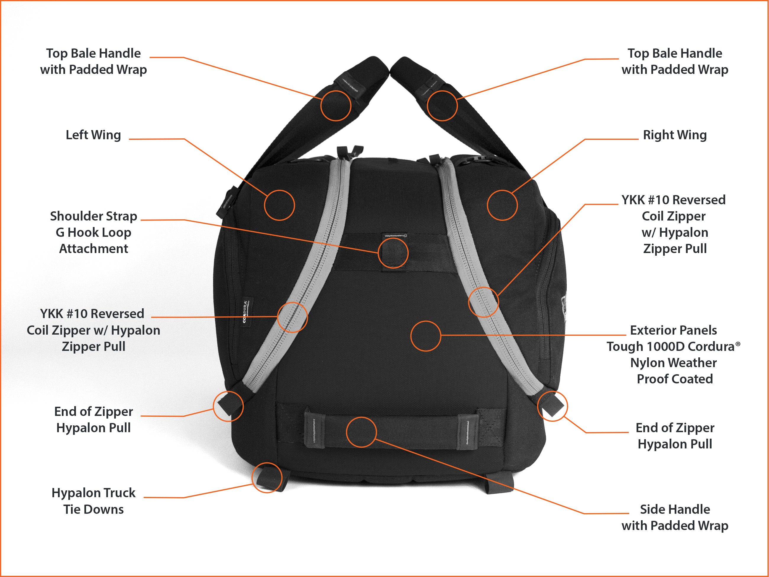 – Ultra Durable 1000D CORDURA® Nylon PUx3 + WR (Unmatched durability and resistance to abrasions, tears, & scuffs)