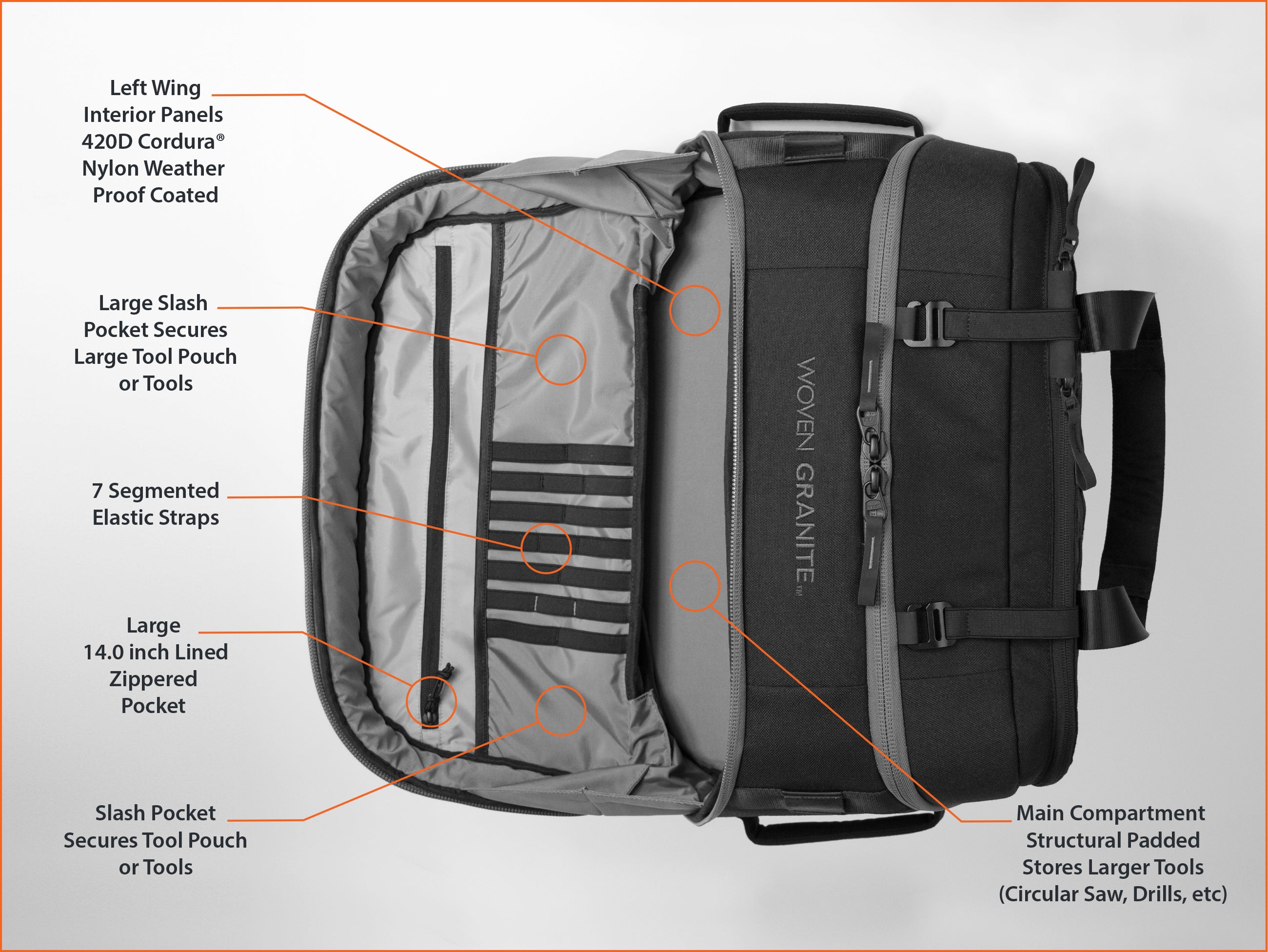 - Left Wing’s Wide Mouth opens 105 degrees to lay completely flat, easily load larger tools, circular saw, full size drills, and other full size power tools. Zippered pocket | slash pocket | gear webbing secure hand tools and a Summit pouch.